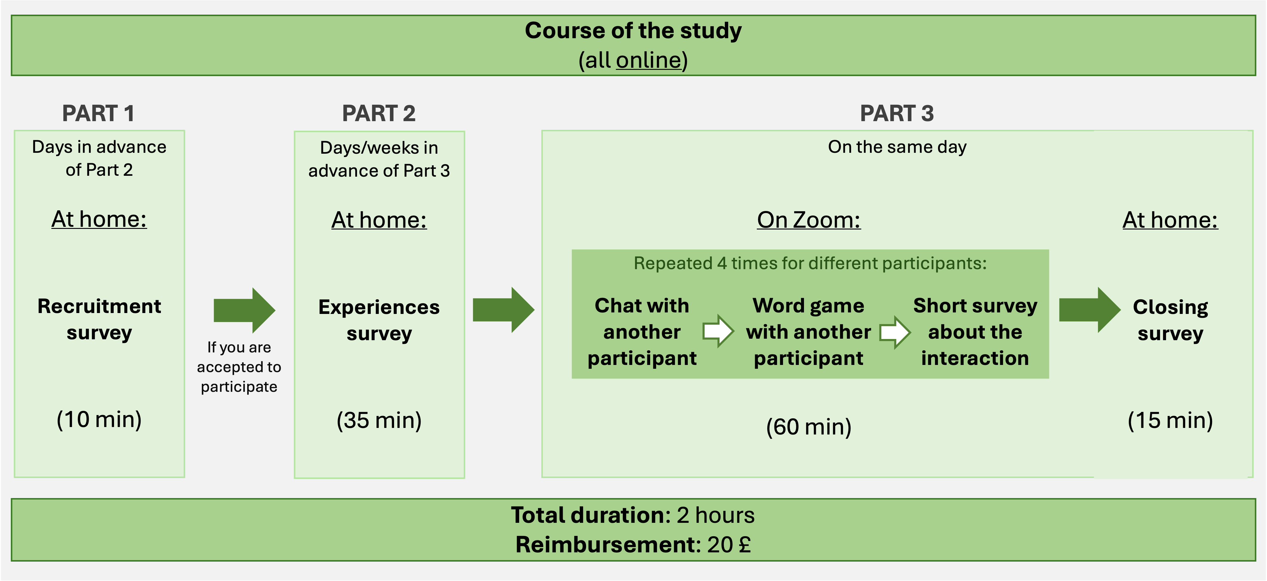 In general, you will complete some online surveys and then join for an hour to chat and play a game with other participants on Zoom. Here’s a summary: